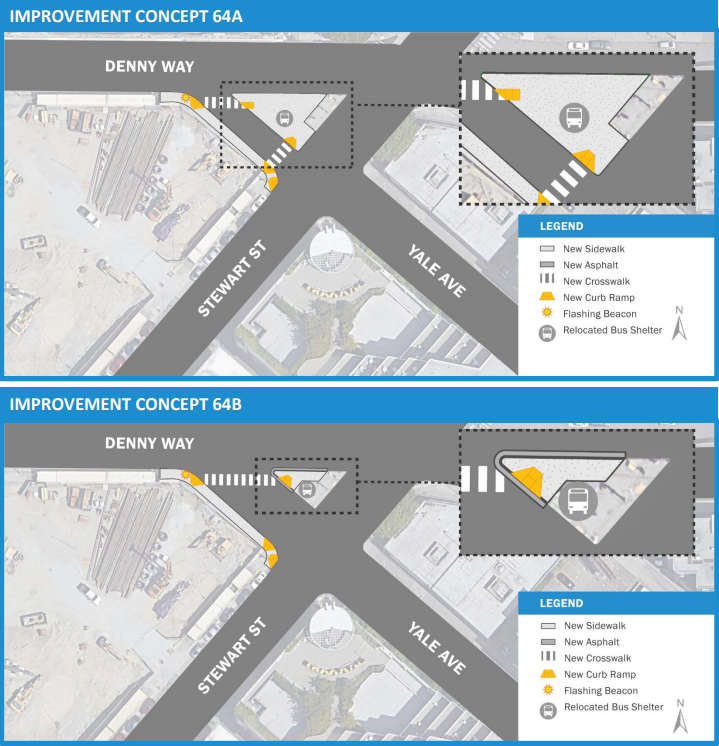 This is Seattle’s worst intersection, according to our readers–twice. This would spend $250,000 to improve the bus island for the eastbound Route 8, add a crosswalk directly parallel to Denny (currently people on foot have to detour on Yale to Stewart), and improve lighting. The project also lists creating dedicated space for cyclists, but it’s not at all clear how that would work.