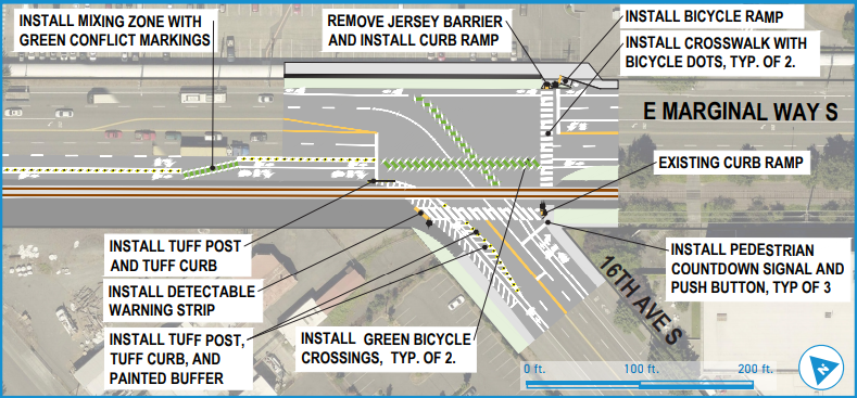 E Marginal Way is a segment of the connection between Georgetown and South Park that currently has painted bike lanes. E Marginal Way is envisioned to have a multi-use trail, and this $400,000 project would increase visibility for pedestrians and cyclists using the intersection at 16th Ave S.