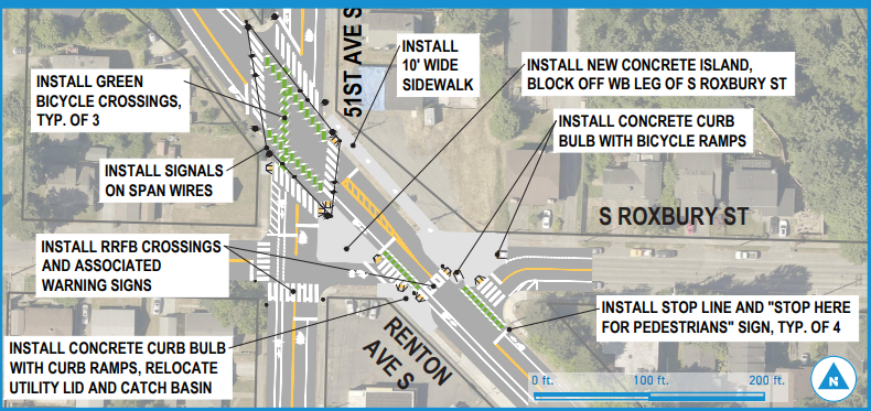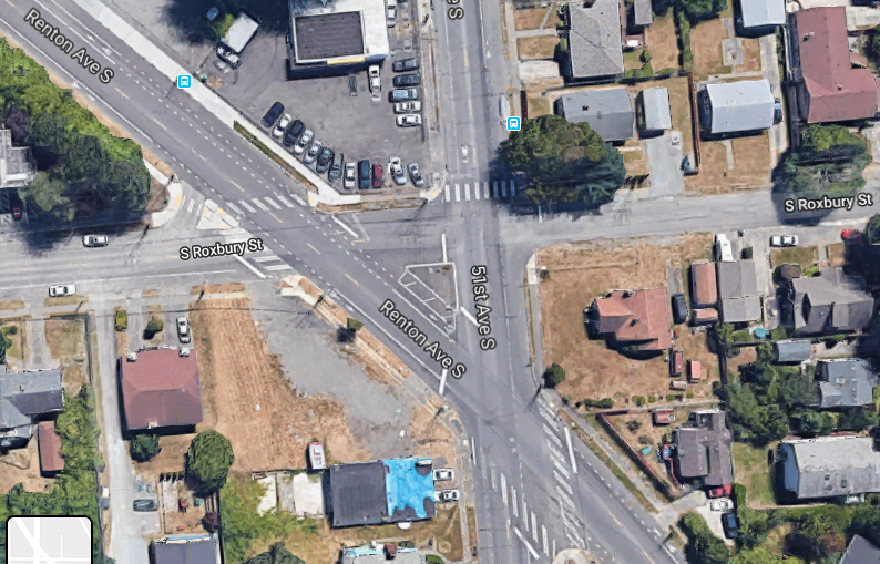 This was originally proposed as a roundabout but changed to a full traffic signal through the SDOT evaluation process. Renton Ave S/S Roxbury/51st Ave is a massive intersection created by angled streets meeting. Insanely, there is not a traffic signal currently, just a flashing red light and stop signs.