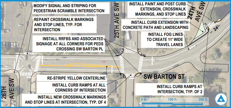 In early July, a woman was hit and killed by a motorist while crossing the street at a mid-block crosswalk adjacent to the Westwood Village shopping center. This $453,000 project would attempt to improve safety directly to the east of where that incident occurred, by converting a signalized intersection at 26th Ave SW to an all-way pedestrian scramble and adding flashing beacons and marked crosswalks on all sides of the intersection at 25th Ave SW where there are currently none. Another smaller crosswalk along Barton at 24th Ave SW on the north side of the street would also be painted.
