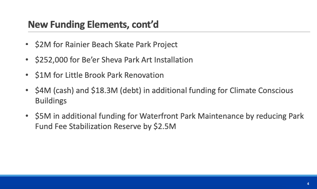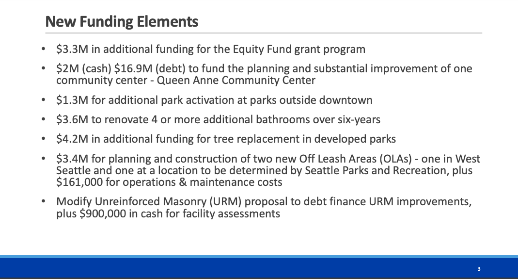 - Queen Anne Community Center* ($2 million in cash, $16.9 million in debt — the single community center largest increase over Harrell’s proposed spending plan)