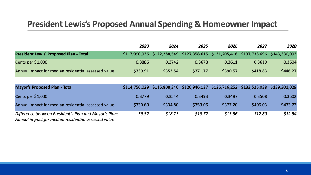 The amount would decrease slightly over the six-year period to $0.36 in 2028, maintaining the approximate $0.01 increase over the Mayor’s plan.