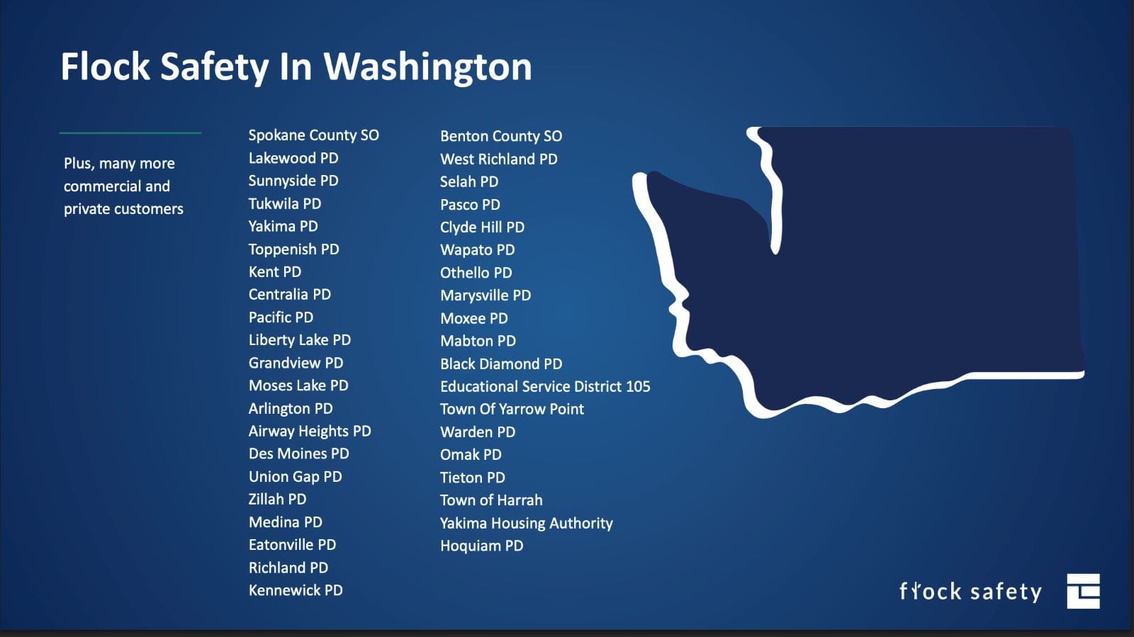 Washington municipalities that now have Flock ALPRs include Edmonds, Lynnwood, Monroe, Mill Creek, Everett, Arlington, Redmond, Mount Vernon, Sedro Wooley, Normandy Park, Puyallup, Kent, Olympia, Auburn, Anacortes, Des Moines, the Federal Way HOA, Medina, Sumner, Bonney Lake, Renton, and Tukwila, among many others.