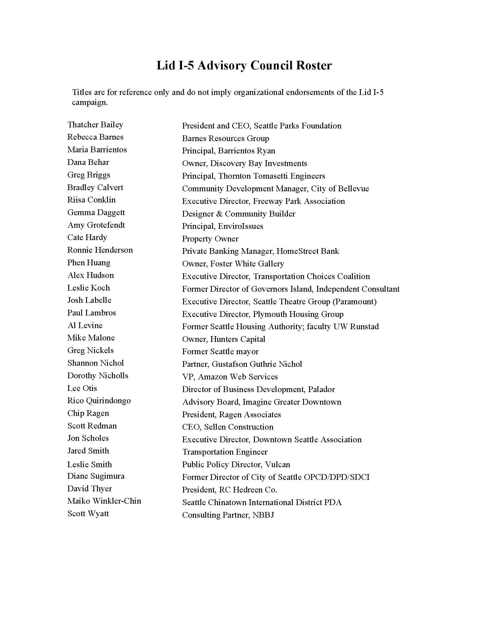 To better address the scale and complexity of the task at hand, the Lid I-5 Steering Committee has recruited an Advisory Council of distinguished experts and community members, including 30 of Seattle’s leading business leaders and technical specialists, to assist with technical guidance, long-term strategy, community engagement, and fundraising.
