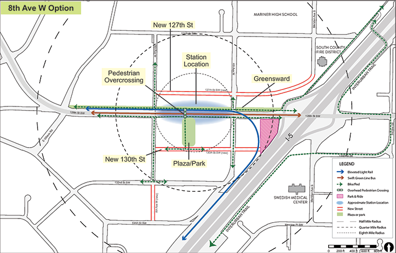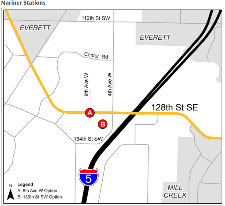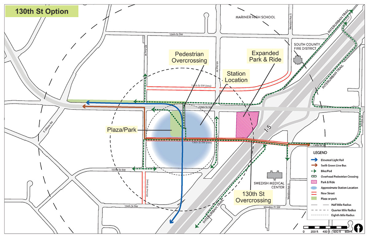 For Mariner Station, both options are west of I-5, but the 130th Street option strikes me as having the edge thanks to superior station access via a pedestrian overpass over I-5, which links to the newly created 130th Street. That said, a hybrid option may also be possible that keeps the overpass even with a station farther to the north, which would be closer to existing Swift Green Line bus service on 128th Street SW and saving buses the need to deviate from the corridor. Mariner Station will also include an additional 500 parking stalls.