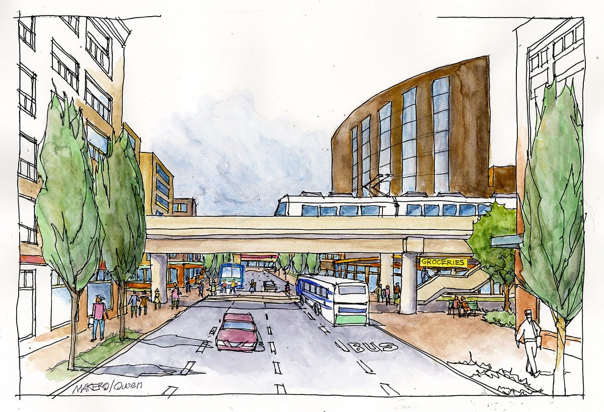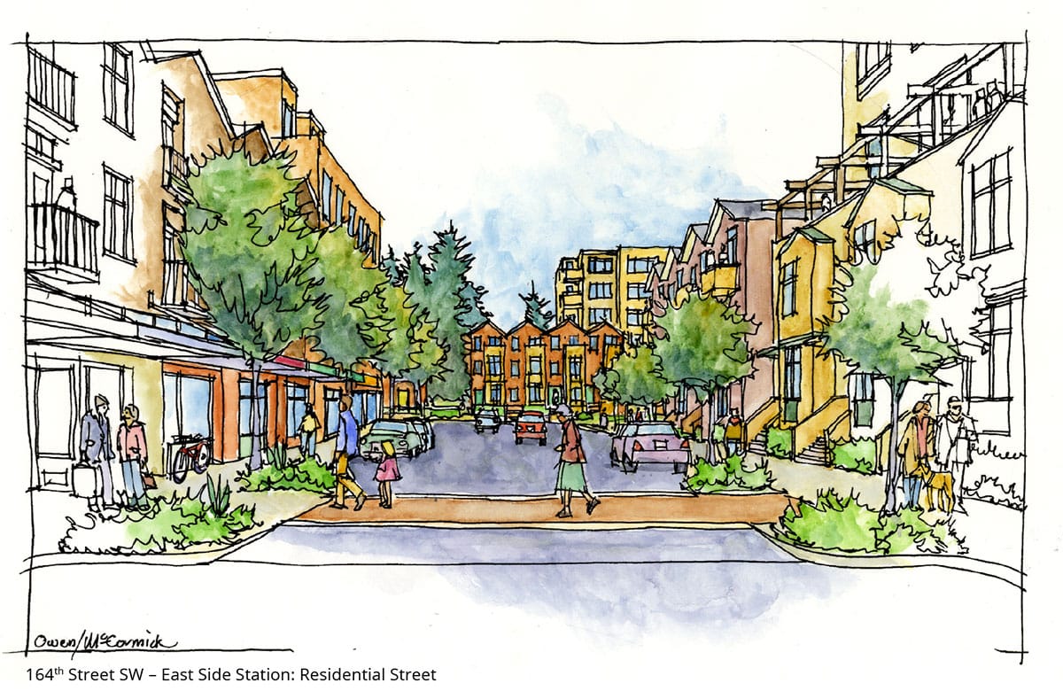 The survey includes a description of transit-oriented development (TOD) that suggests that mixed-use buildings ten stories high or more (some areas already permit this level of density) are envisioned with an eighth mile of the station–along with a plaza or open space to act as a community focal point. Snohomish County described mostly residential midrise buildings in the next eighth mile out, while low-rise up to six stories are assigned between a quarter mile and a half mile out.