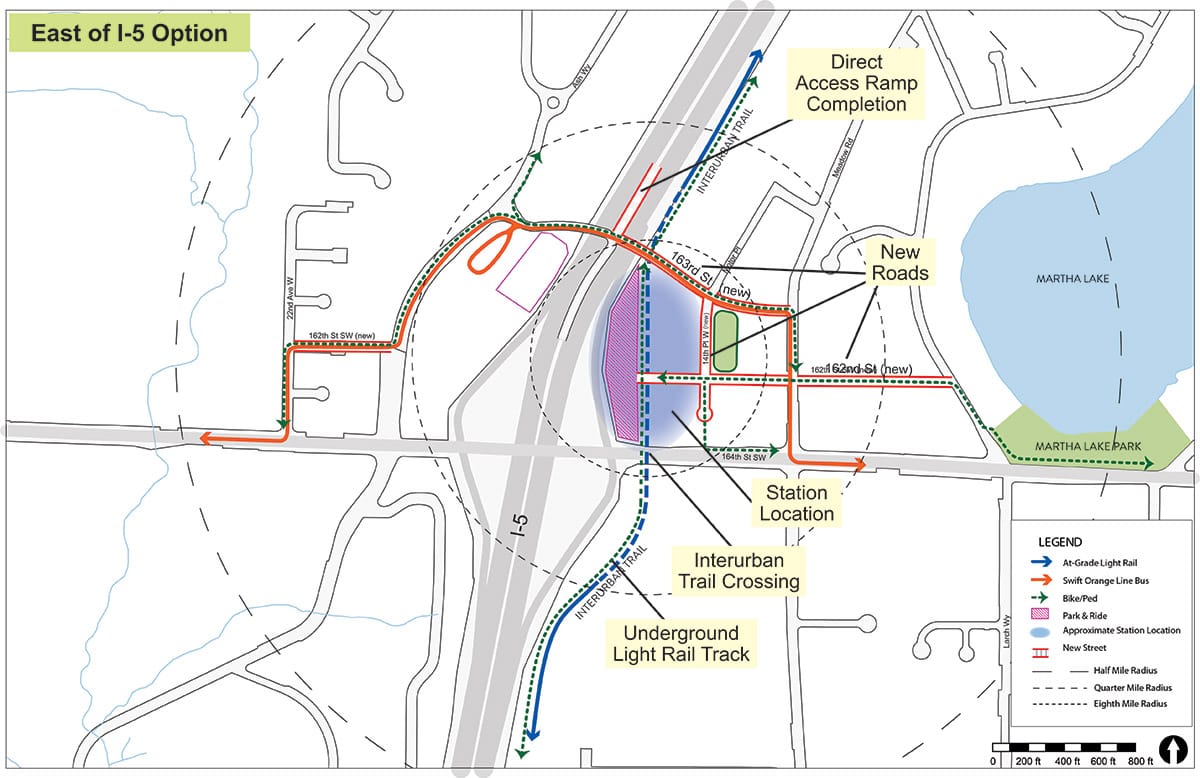 For Ash Way Station, the east of I-5 option offers superior transit-oriented development (TOD) potential and station access, and the park-and-ride screens the station from the freeway. Wedging the station between the parking structure and I-5, as the other option would do, would make for both less TOD and a less pleasant station. No net gain in parking is proposed since 1,019 spaces already exist here. By 2024, the Swift Orange Line will run right by the station site and provide a frequent crosstown connection to it. Both options would route the bus line across a new bridge to bring the rapid service closer and construct a new direct access ramp for local bus service and high occupancy commuters. The Interurban Trail runs along the east side of I-5 and could easily interface with the station in the East of I-5 option providing excellent access for people walking, rolling, and biking.