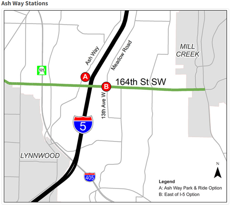 The county is presenting two options each for Mariner Station and Ash Way Station. Both hug the I-5 corridor, which does inhibit their walksheds and development opportunities. However, plenty of opportunity still exists, and even more will present themselves when this plan culminates in a Subarea Plan with upzones and is adopted into the Comprehensive Plan. The station at SR-99 and Airport Road is provisional, but Snohomish County should also be planning that subarea like the others so it’s ready when the provisional station is added–and because even if it’s not, it’s worthy of urbanizing since it’s already at the intersection of the Swift Green Line and Blue Line, Community Transit’s two bus rapid transit lines.
