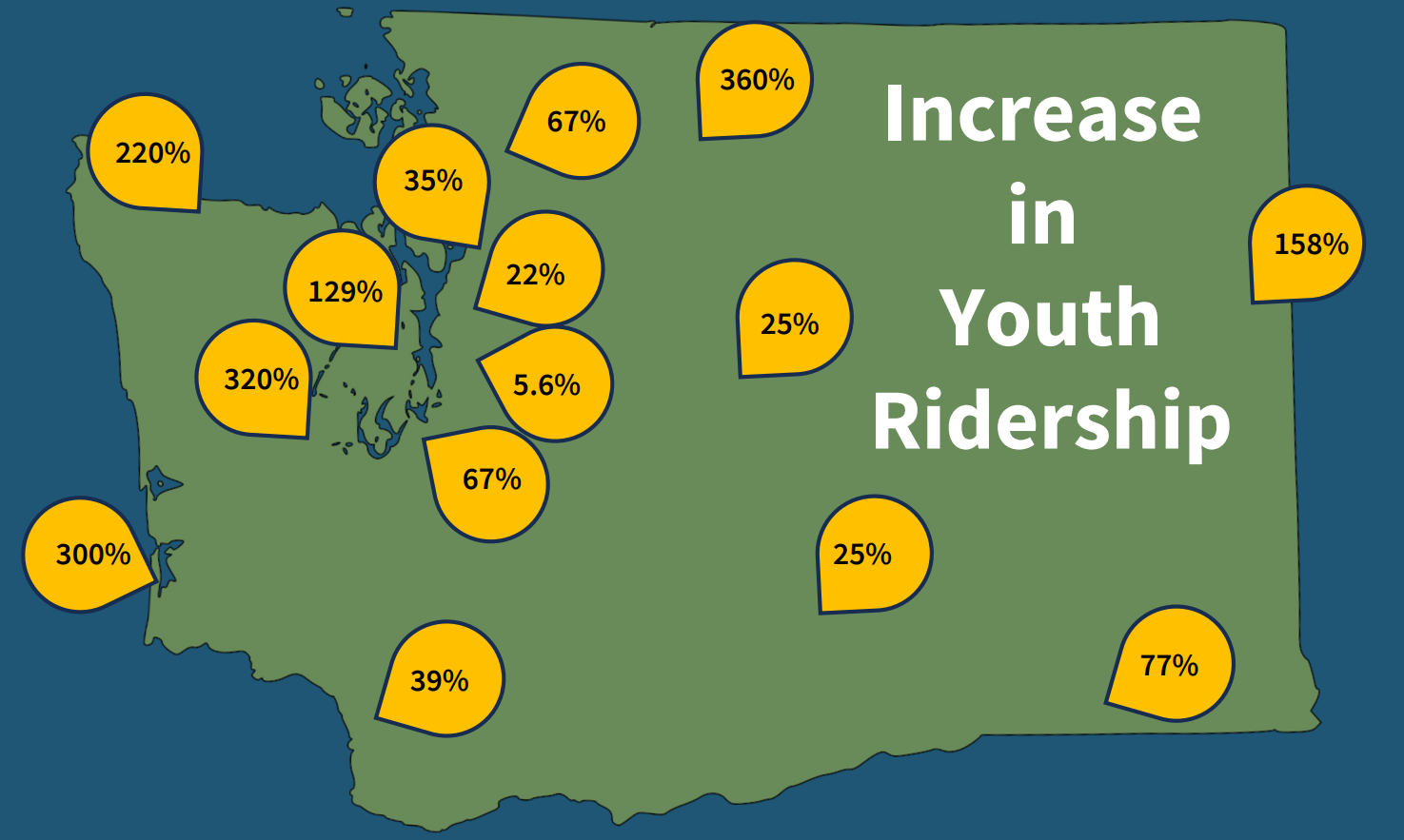 On top of city transportation projects, the repeal of the CCA would have a major impact on the public transit agencies that serve Washington’s cities as well. The 2022 Move Ahead Washington transportation package offered transit agencies brand new operating grants for service expansion in exchange for making transit fare-free for all kids under 18, an offer that every single agency statewide agreed to. Those programs immediately paid dividends when it comes to youth ridership, with increases ranging from 129% in Kitsap County to 360% in Okanogan County.