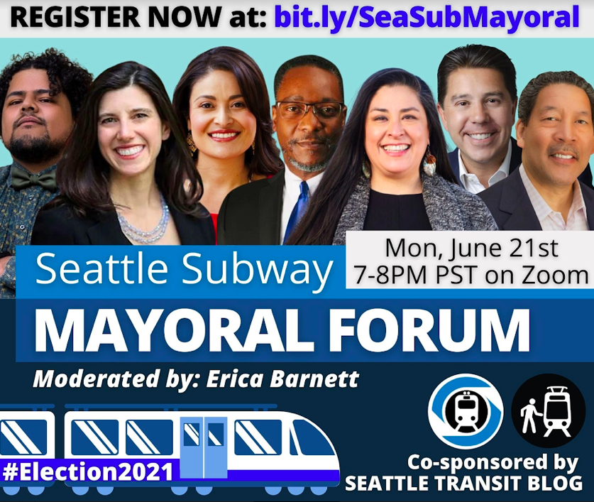 Seattle Subway and co-sponsor Seattle Transit Blog, both members of the MASS Coalition alongside The Urbanist, held a mayoral forum focused on the topic of mass transit in the Seattle area. It was the rare 2021 political discussion in which the word Covid never made an appearance, although references to economic challenges and other repercussions resulting from the pandemic haunted the background of several candidate responses.