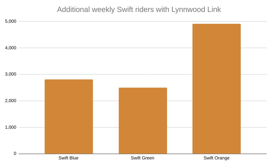 Community Transit’s numbers show that over 82,000 people per week boarded a Swift bus across all three frequent routes, an increase of 10,400 compared to the month before the service change. That 14% jump is a clear product of the network effect in action, as frequent rail service to Shoreline, Mountlake Terrace, and Lynnwood enables riders to make easier connections than possible before. With 10-minute service throughout most of the day on the Swift network, the frequent buses extend Lynnwood Link’s reach further into Snohomish County.