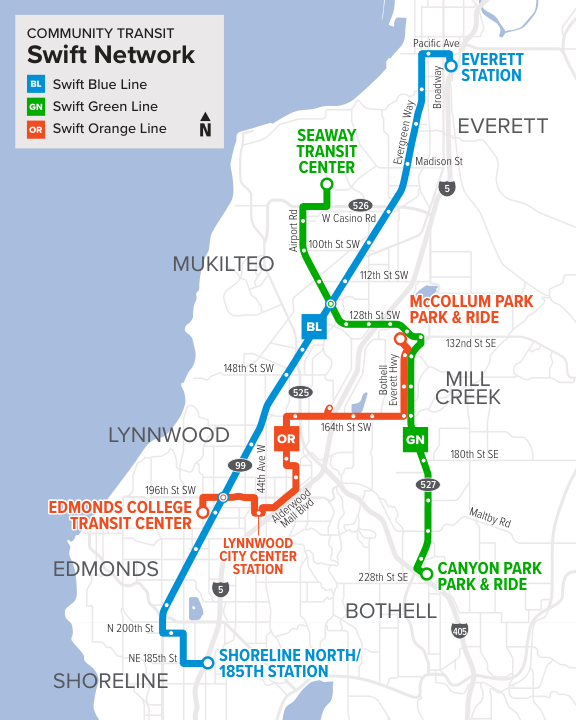 The extension of Sound Transit’s 1 Line into Snohomish County is already paying off for Community Transit and providing a ridership bump in its frequent transit network. Data from the weeks following the agency’s biggest service change in years shows significantly increased ridership on the entire Swift bus rapid transit (BRT) network, which includes the Blue, Green, and Orange Lines. That September 14 service change reoriented Community Transit’s entire bus network, discontinuing most service running all the way to Downtown Seattle, and instead focusing on more frequent service within Snohomish County.