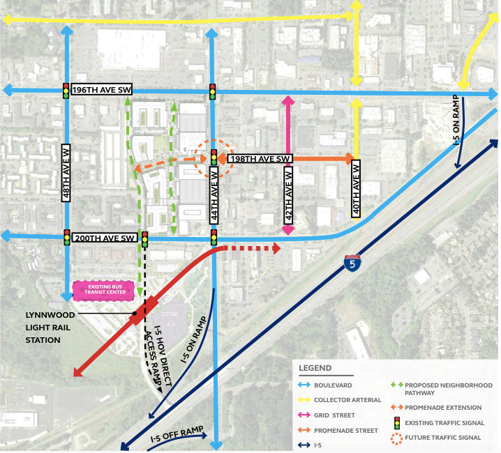 Since then, the City of Lynnwood has identified two areas for future dense development: the City Center, which will be adjacent to the Lynnwood Station, and the Alderwood Mall, which will be connected to light rail by buses and the Interurban Trail. A future extension will also add a light rail station at the Alderwood Mall.