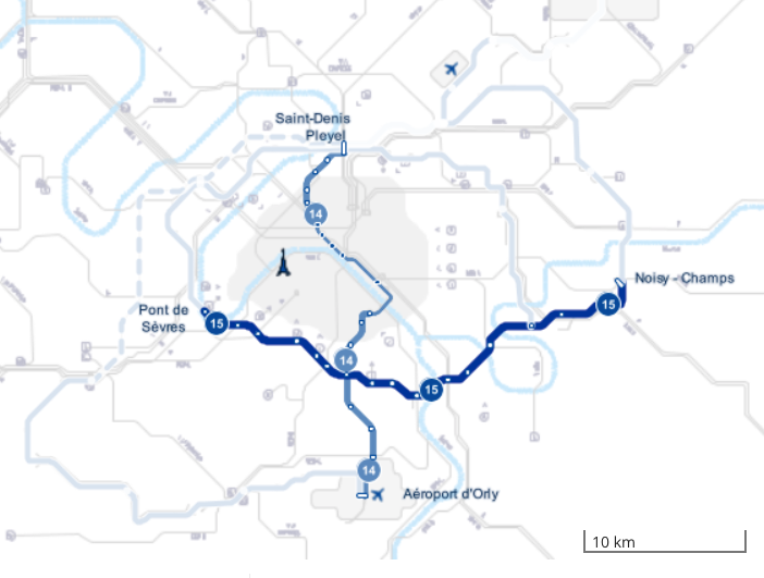 However, the two primary modes of rail transportation used by people living Parisian suburbs are the RER (Réseau Express Régional) and Transilien, a play on the word “Francilien” used to describe residents of the Parisian suburbs. Both rail lines primarily operate to move riders into the city, and as a result, traveling to destinations within the suburbs can be long and challenging. For example, a student or researcher traveling from Orly Airport to the Paris Saclay University Campus has to travel for over an hour under the current conditions. Once the Grand Paris Express expansion is completed, the trip will take about 15 minutes.