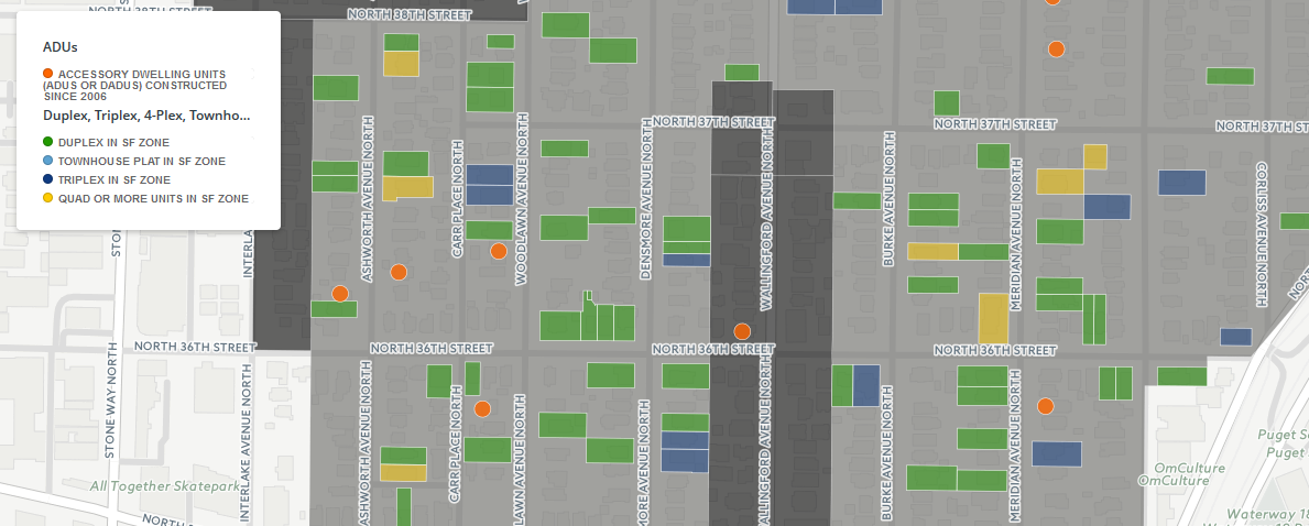 A new research product from the Sightline Institute, a local sustainability think-tank, reveals the rich variety of housing that already exists in Seattle’s restrictive single-family residential zones. The map comes amid neighborhood opposition to rezones that will unlock new affordable housing and calls for preserving the “character” of single-family residential areas. To the contrary, Seattle’s low-density neighborhoods already host a diverse array of multi-unit housing, including duplexes, townhomes, and accessory dwellings.