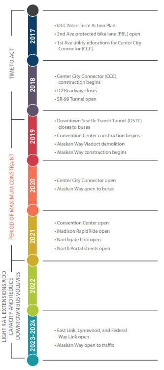 - The Center City Connector streetcar was assumed in planning but with Durkan’s executive stop-work order, its future is now uncertain and it may not open until 2021 (or later) if work is resumed.