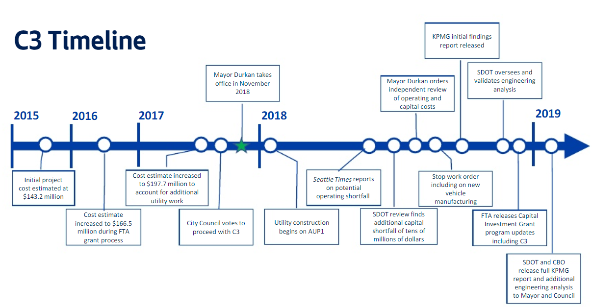 Mayor Durkan criticized her predecessor for poor management of the project saying the Murray administration had relied on guesstimates and insinuating the project had been rushed. She portrayed those mistakes as setting the project on a collision course with the FTA.