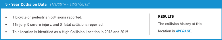 Like every place in the city, no collisions at this intersection would be the goal. But the data showing this spot in the middle of the pack for collisions, with few serious injuries reported, begs the question of how it was prioritized to the top of the list to receive these one-time funds being allocated to Vision Zero.