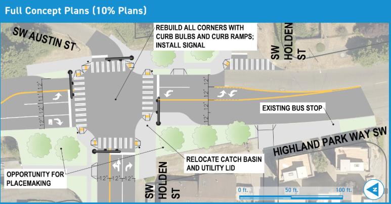 The budget proposal allocates 20% of the Vision Zero priority funding to a single intersection in West Seattle, a project long envisioned as a roundabout at the tricky intersection of Highland Park Way SW and SW Holden St. This project has been seeking funds from the Washington State Department of Transportation and multiple rounds of City of Seattle grants (including two rounds where the project was not selected for Neighborhood Street Fund projects) but has been unable to secure funds.