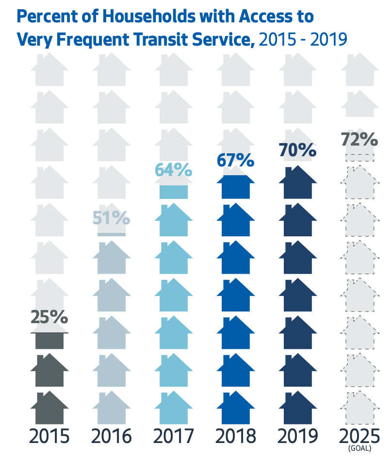 The current transportation benefit district has focused on improving the “very frequent” transit network, which means 10-minute service all-day (defined generally as 6am to 7pm) on weekdays. The proposed measure is a noticeable downgrade for supporting the “15-minute” transit network. Seattle had been on a path of expanding the 10-minute very frequent network to 72% of households by 2025.