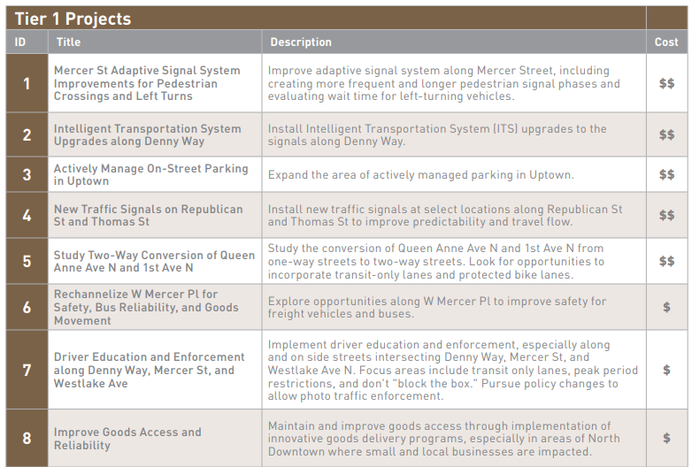 The number one project in the “vehicle” category in the vicinity of Key Arena is improvements to our existing adaptive signal system on Mercer Street, with the number two project being to upgrade the Denny Way corridor on the opposite side of Seattle Center with similar upgrades.