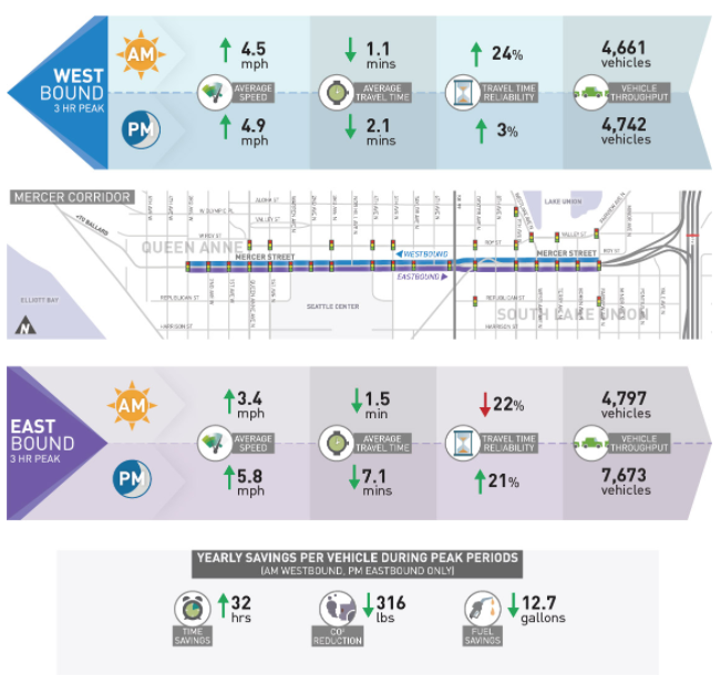 Since the launch of SCOOT on Mercer, regular statistics have been posted to the project page showing the system’s performance. The data from January of this year shows 7,673 vehicles moving through Mercer during the three hours of PM peak, when there is the most eastbound demand on the street. That’s actually down from the first few weeks of SCOOT’s implementation, where the total numbers were closer to 9,000 vehicles.