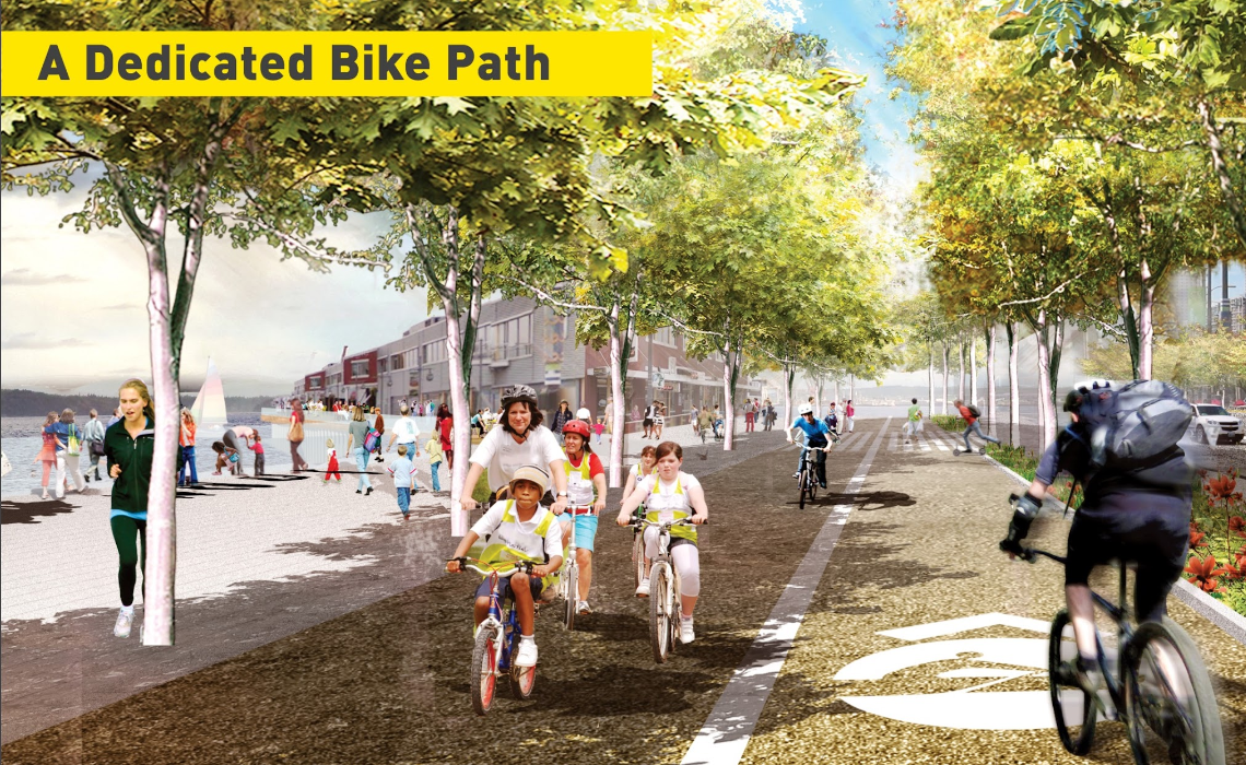 One of the biggest opportunities to come with the waterfront project, a new north-south bike path, had long been presented as 12 feet wide, but after installation, it was found to be around three feet shorter in some segments, and curves in the path to accommodate space for on-street parking were rarely emphasized in graphics.