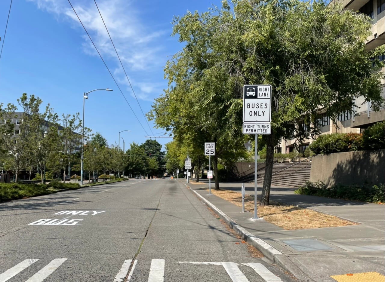 Last weekend, the Seattle Department of Transportation answered the call and installed temporary bus lanes on NE Campus Pkwy in the westbound direction. The bus lanes cover a distance of about five blocks, which is enough to bring buses closer to the University Bridge and Roosevelt Way NE to skip past idle cars. However, modest paint with “BUS ONLY” and signs mark the lanes. That doesn’t appear to have garnered high compliance by motorists, at least on Wednesday afternoon.