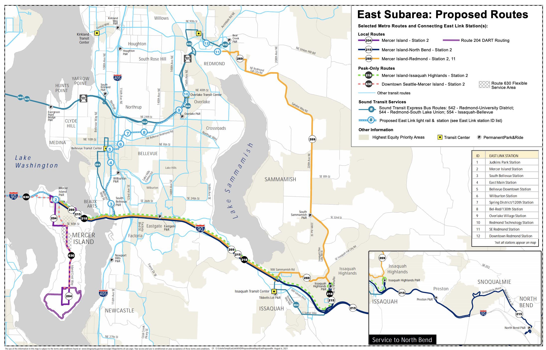 - East Subarea (I-90, Mercer Island, Sammamish, Snoqualmie, and North Bend); and