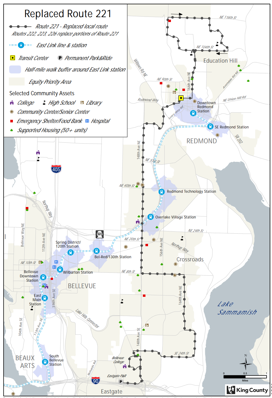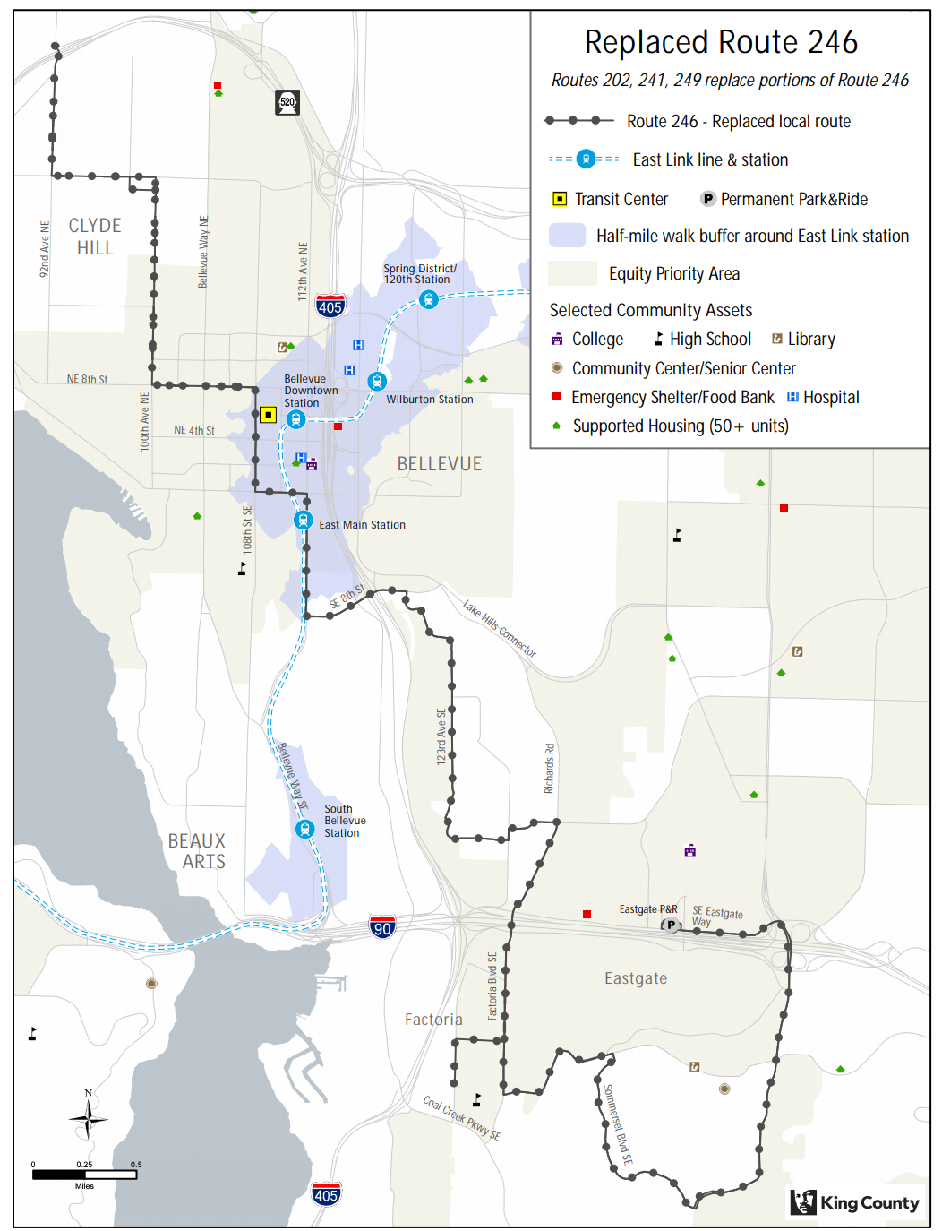 The big ideas for the South Subarea proposal are a strong connection to the future South Bellevue Station and bidirectional Route 342 from Renton to Shoreline. The proposal involves changes to five routes, including the elimination of peak-only Routes 114 and 167. The latter two routes would essentially be consolidated to a shortened Route 111 with improved span of service. As for Routes 240 and 342, these routes would see alignment revisions mostly in Bellevue with some minor changes in Renton.Central Subarea proposalsThe big ideas for the Central Subarea are: connections to the many light rail stations Bellevue and Redmond are getting; wider Central, South, and East Bellevue coverage; and better connections to and service in Issaquah. This proposal involves creation of several new bus routes and consolidation of many others. Strong poles for service would be Bellevue College, Eastgate Park-and-Ride, Crossroads, and the future South Bellevue, Downtown Bellevue, Overlake Village, and Redmond Technology Stations.East Subarea proposals