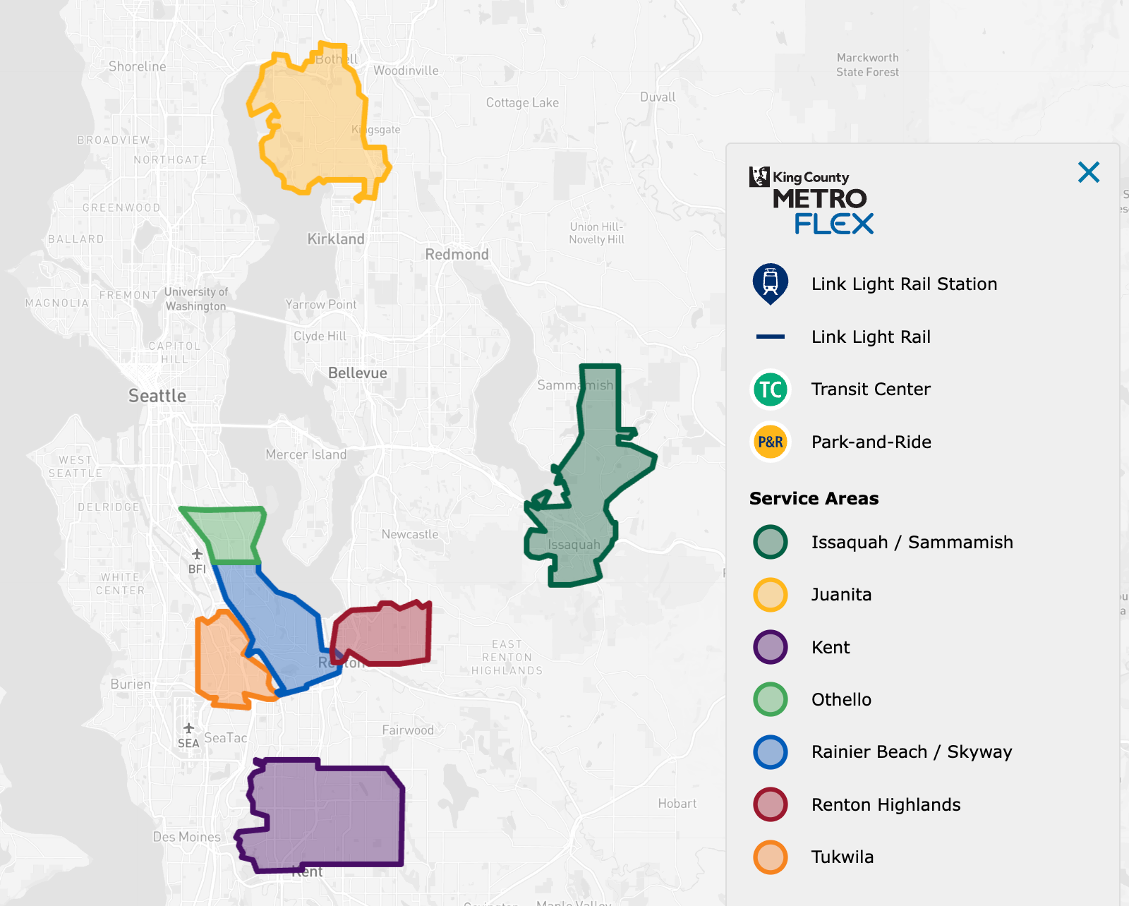 The new service joins seven other Metro Flex service areas, including two in Seattle. Most of these are concentrated on the South End with Kent, Renton Highlands, Tukwila, Othello, and Rainier Beach/Skyway. But there are service areas in Juanita/Kenmore/Bothell and Issaquah/Sammamish.
