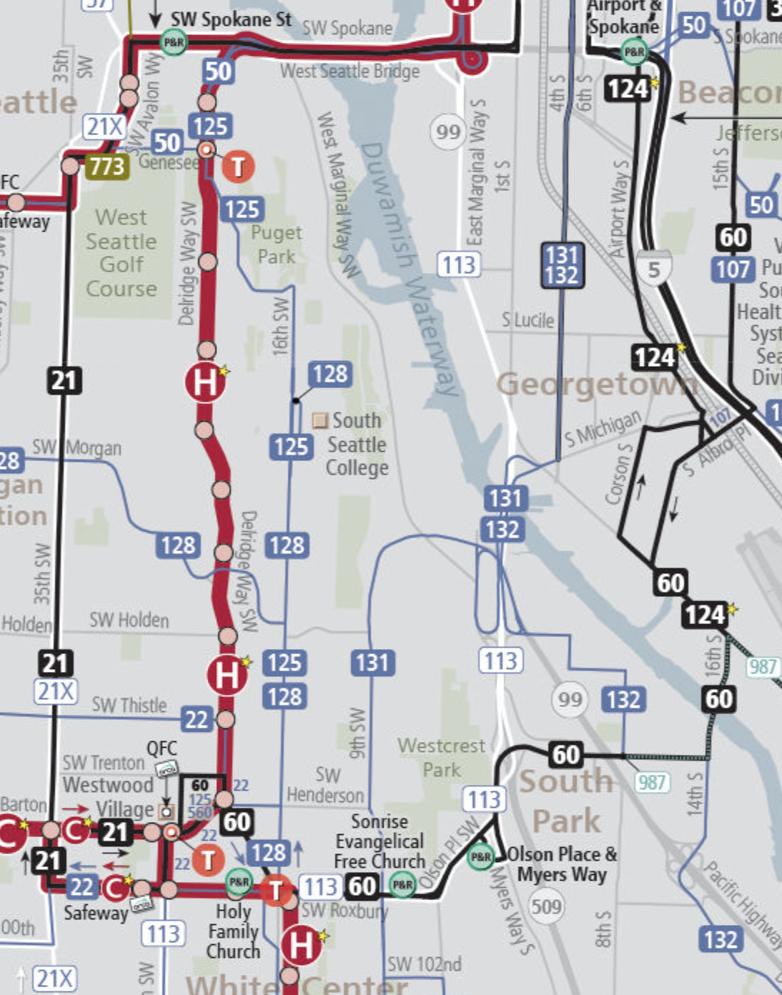 Existing bus service in the area is provided by a mix of all-day routes, including Routes 60, 125, 128, 131, 132, and the RapidRide D Line. Most of the routes, however, run north-south, making connections between some destinations relatively inconvenient by the transit. The main exception is Route 60, which runs east-west between Westwood Village and South Park. Metro Flex will enable point-to-point service anywhere within the Delridge/South Park service area. Major community draws within it include South Seattle College, Chief Sealth High School, and local libraries along with Westwood Village, White Center, and other business districts.