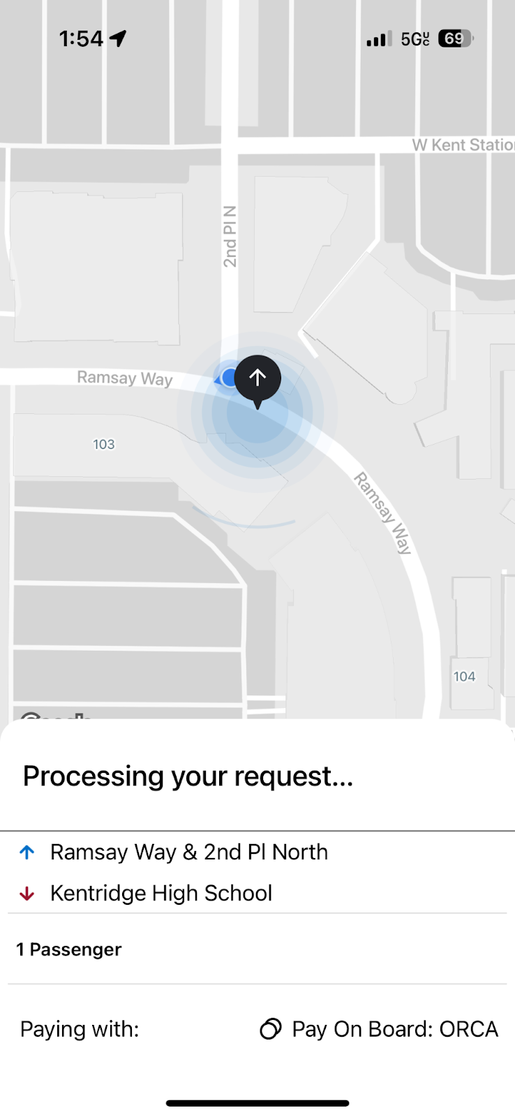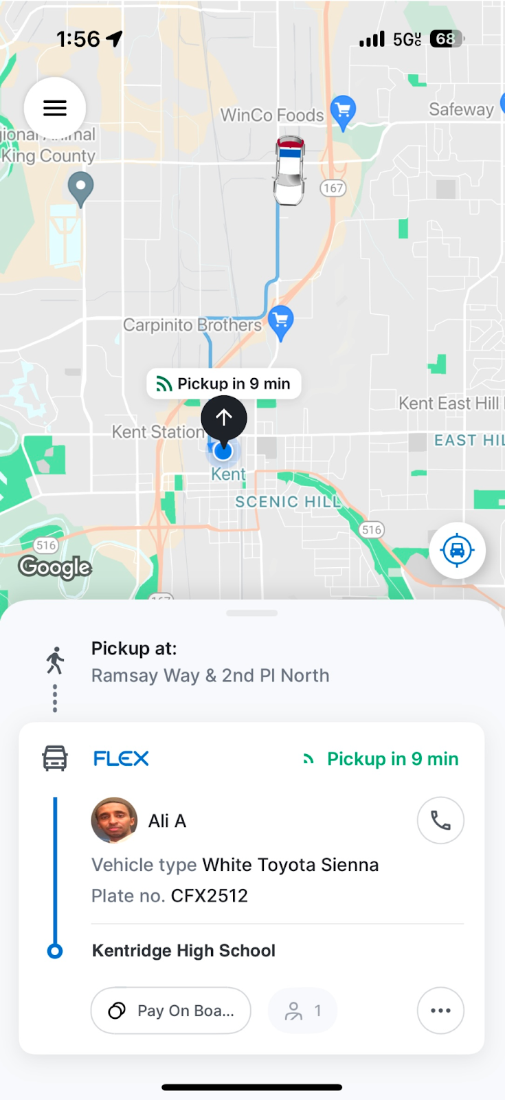 I started my journey in Metro Flex’s Kent service area at Kent Station. Kent Station is a shopping center just north of downtown Kent and next to Kent’s Sounder Commuter Rail Station. Unlike what some of the reviews said, booking a ride on the Metro Flex app was quite simple. After setting my location and destination, I was left waiting a few seconds so the app could process my request. The app then found a location for a nearby pickup point that helped make the van’s route efficient. After confirming all of the details, I was luckily able to book a van. However, I had to wait another nine minutes before the van came, which gave me some time to stroll around Kent Station.