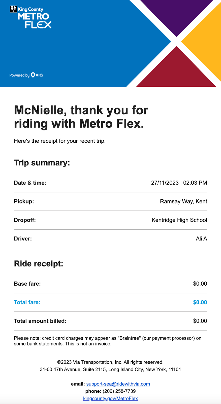 And a few minutes later, I received an officially emailed receipt from Metro Flex about my ride.