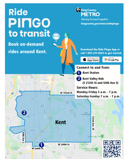 In a statement, Kent Mayor Dana Ralph praised the new service option. “Connecting our community with a diverse set of transit options continues to be a priority of ours at the City of Kent. Ride Pingo to Transit will provide much needed access to public transit for Kent residents that is affordable and flexible,” she said. “This service will empower our residents to better access our transit hubs and work in the Kent Valley and beyond. I’m very excited about the launch of this new service and am looking forward to trying it out myself!”