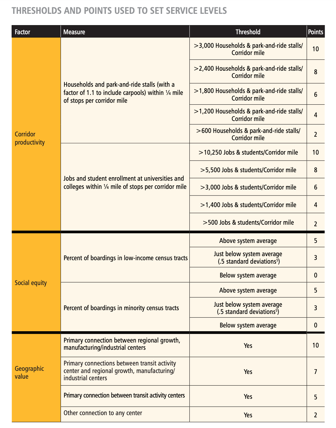 In determining where service growth (Priority 3) goes, Metro uses three general factors to assess priority. The factors are equity, productivity, and geographic value. Each factor has a specific definition in the guidelines.