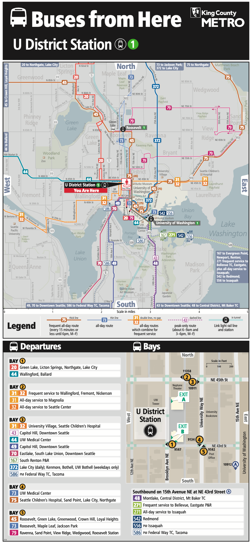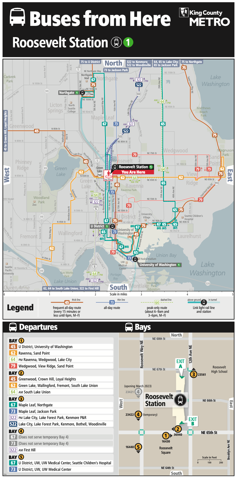 The primacy of light rail is subtly reinforced with the area maps drawing in the underground and aboveground portions of the 1 Line through Montlake, the University District, Roosevelt, and Northgate with two sea green lines. Again, light rail station icons also draw attention to station locations.