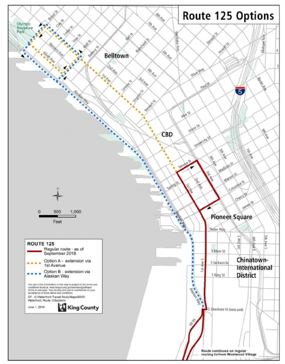 - Route 125 could be rerouted from 3rd Avenue to 1st Avenue or Alaskan Way and extended roughly 11 blocks north to terminate at Broad Street. Metro would need to dedicate one additional bus to facilitate current service levels on the extended route, costing about $750,000 for procurement and another $515,000 per year to operate.