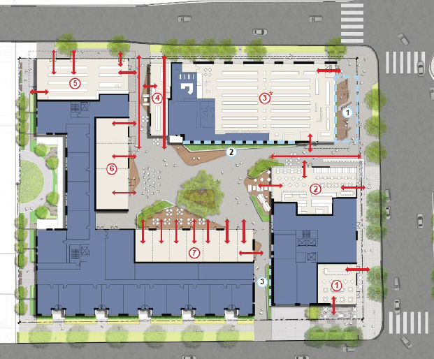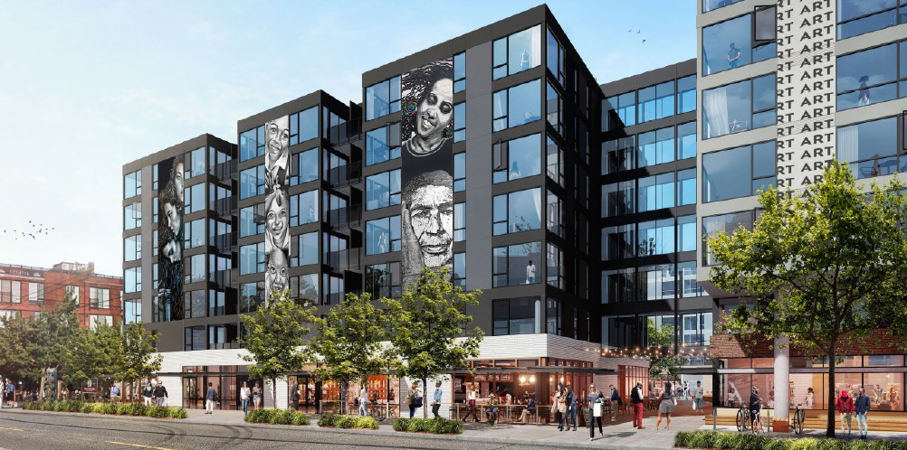 The project includes 432 apartments, 30% of which (130 apartments) will be relatively affordable units, 25,000 square feet of retail space, 227 below grade parking spaces, and a 16,000 square feet publicly accessible square in the center of the project.