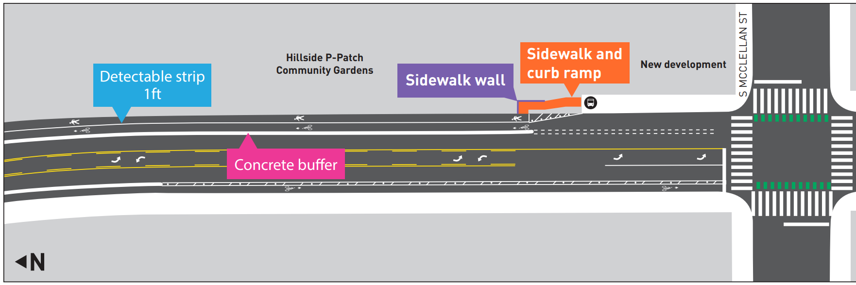 The “bike lane” project is also fulfilling a major promise of the 2015 Move Seattle levy, adding improvements to the area around the Mount Baker light rail station. Funds to improve bike and pedestrian access around the intersection of Rainier Avenue and MLK Jr Way S were specifically called out in the materials available to voters, envisioned for more transformative changes as part of the “Accessible Mount Baker” project. Those changes — which now include filling the gaps in marked crosswalks at the intersection, improving sidewalks, adding curb bulbs and restricting right-on-red — were merged with the MLK Jr Way S protected bike lane project, and now will wait to be completed until the final months of the nine-year levy.