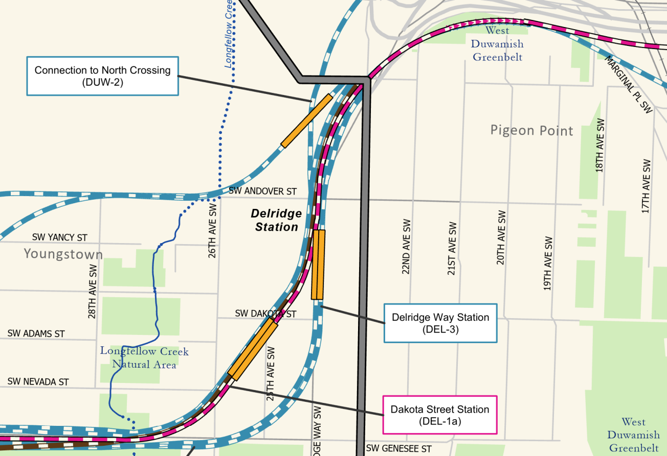 Approved in the Sound Transit 3 ballot measure in 2016, West Seattle Link would add three stations on the peninsula — Delridge, Avalon, and Alaska Junction — and is currently projected to open in 2032. The trackway that Mosqueda and local business owners are raising questions about is north of the planned station in North Delridge, an area also known as Pigeon Point.