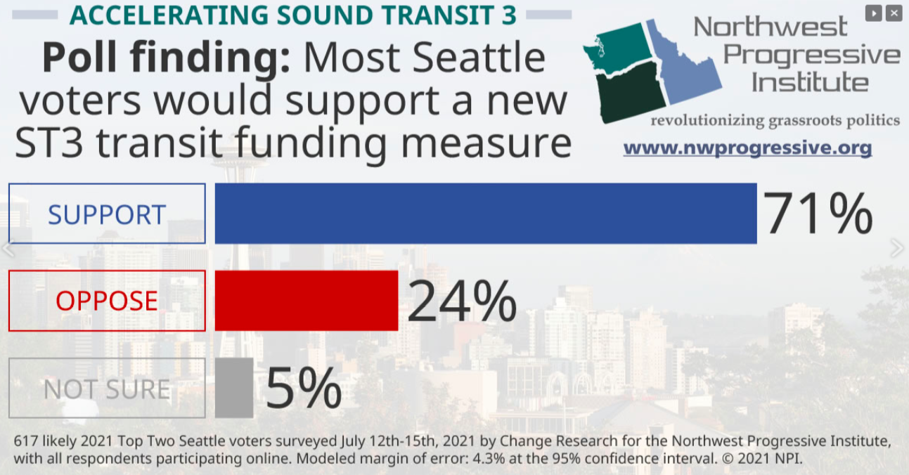 In a recent poll, 71% of Seattle voters said they would approve a new funding measure to avoid Sound Transit 3 delays.