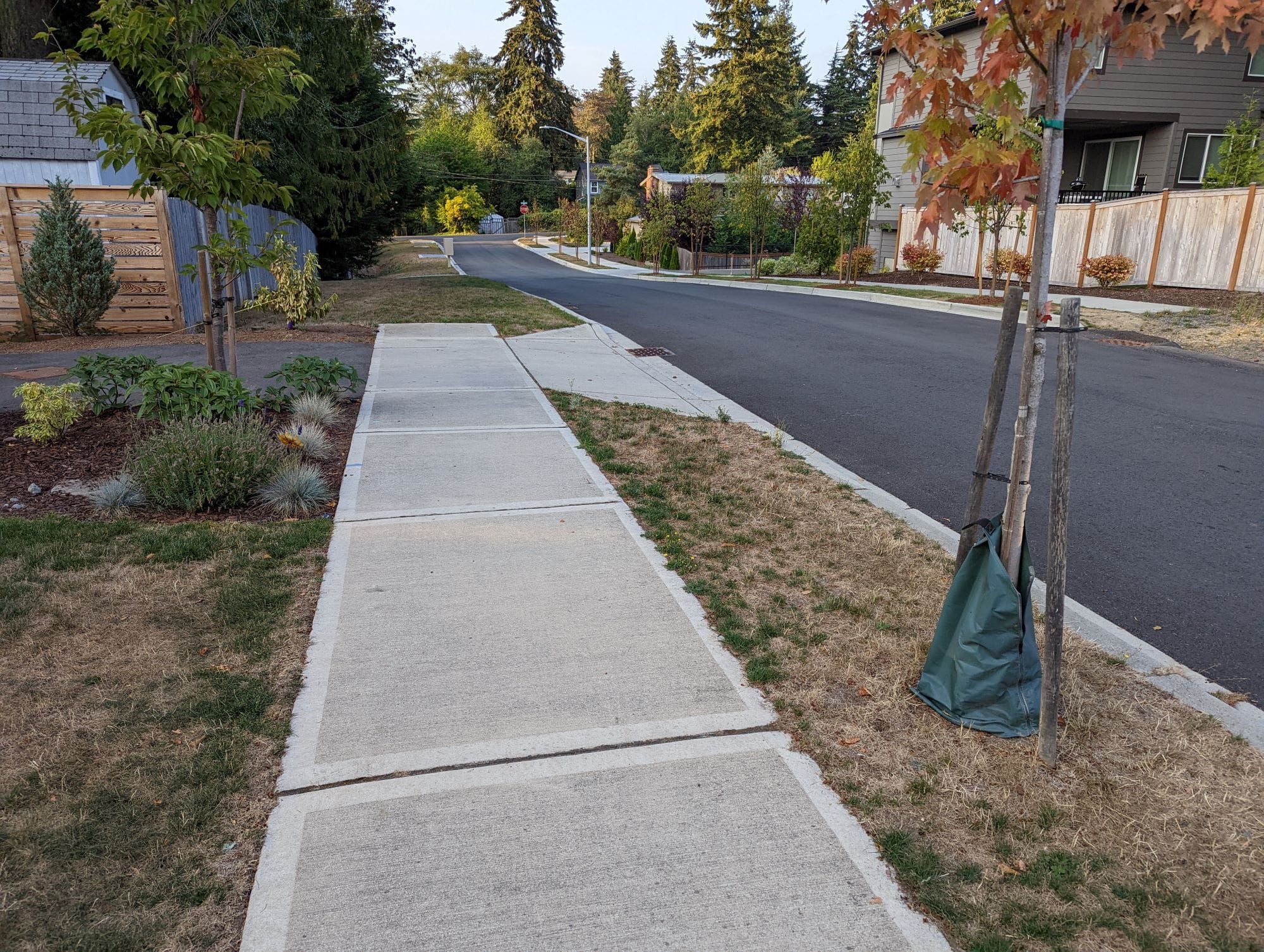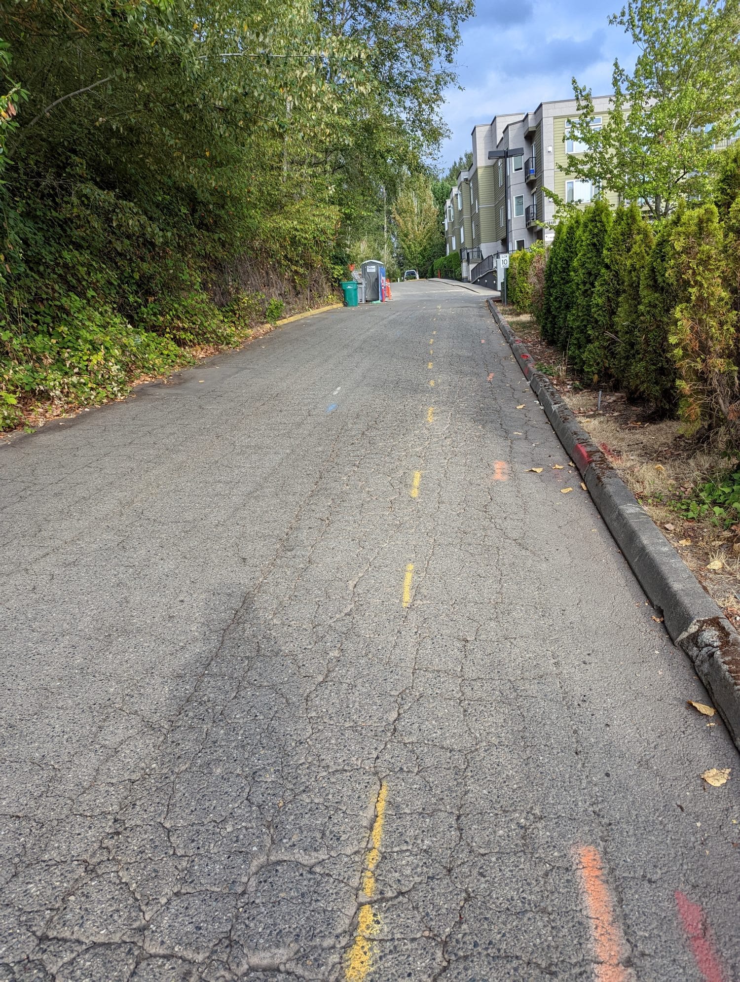 Of the neighborhoods I visited in Kirkland, Finn Hill was home to the worst of Kirkland’s pedestrian environments. The neighborhood is standard suburbia sewn out of single-family home subdivisions. Many of these subdivisions were built without any sidewalks, but the few that did leave behind a smattering of pedestrian infrastructure in the neighborhood. The subdivision development continues to this day. You can easily spot them with their gleaming white sidewalks buffered with fair planting strips and street trees.