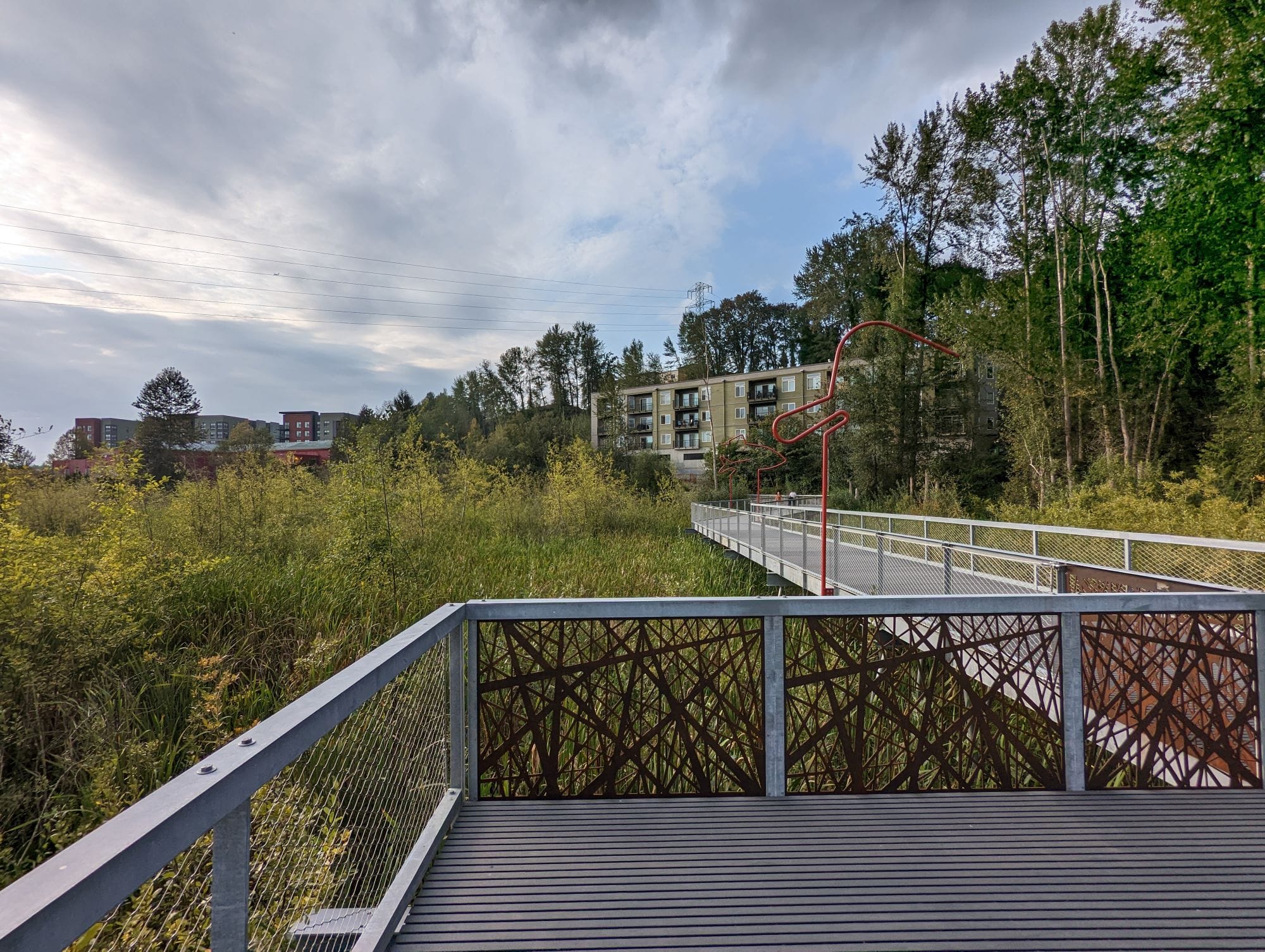 Shielded from much of that traffic is a concentration of public and private investment around The Village at Totem Lake with the large and new private development, surrounding new development, and parks facilities forming a comfortable chain of pedestrian connections. Totem Lake Park and the Cross Kirkland Corridor (CKC) are especially nice with dedicated pedestrian and bike paths. Totem Lake Park’s boardwalk blew me away and has me imagining the awesome and unique connection that it will form with future density on NE 124th Street. This island of walkability will continue to expand with continued work on the CKC and incoming development that should connect even more buffered sidewalks to the system.