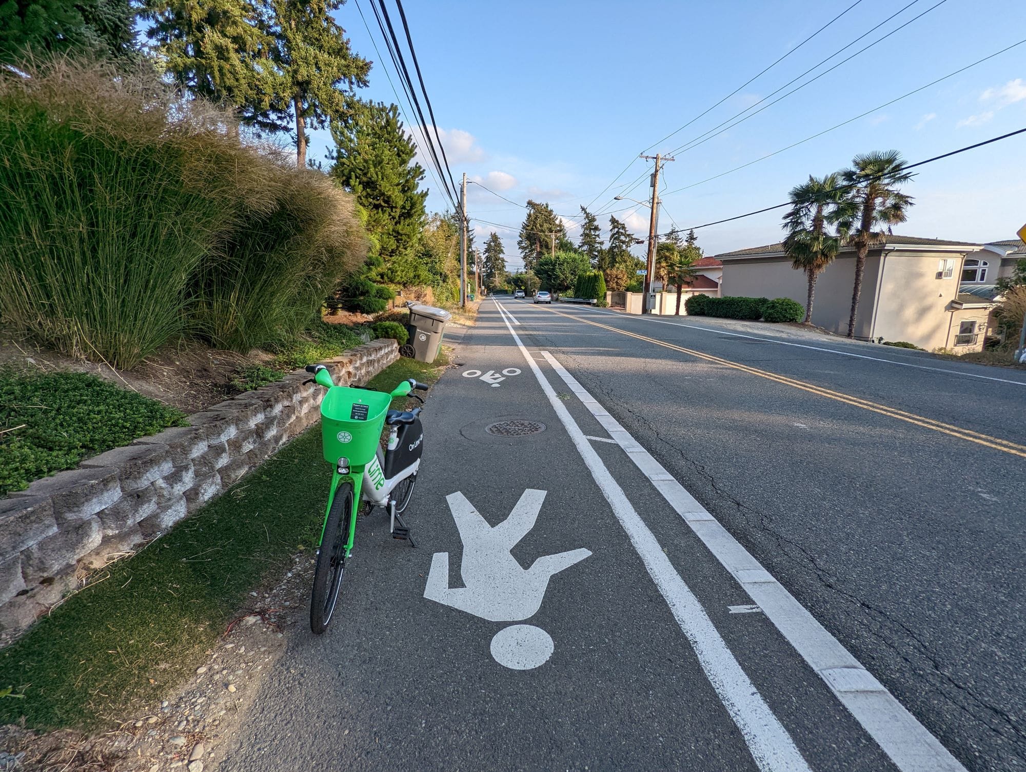A glaring omission to these new additions is the climb up to Finn Hill from Juanita. My route to Finn Hill brought me to Juanita Drive NE, a curving road with a steep incline. It has two travel lanes and painted shared use paths for pedestrians and cyclists. The sometimes poor visibility, speeding traffic, and protection of paint and flimsy posts at times make the trek up Finn Hill frightening and enlightening. My separation from car traffic was at the whim of whatever motorists passed by me then.