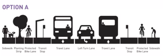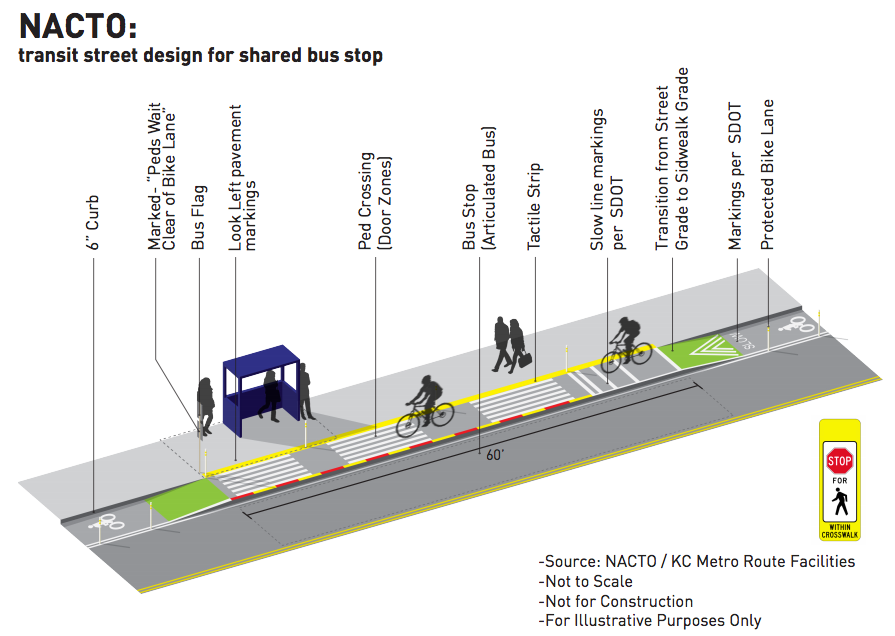 The design includes an 11-foot sidewalk next to a 5-foot bike lane, both at an elevated grade. Busses stop outside of the protected bike lane, in-lane with traffic, and passengers will cross the bike lane and load onto the bus. People getting off the bus cross the bike lane to get to the sidewalk. While this strategy provides more continuous space for people walking and waiting for buses, it relies on people biking to slow and stop for people getting on or off the bus.