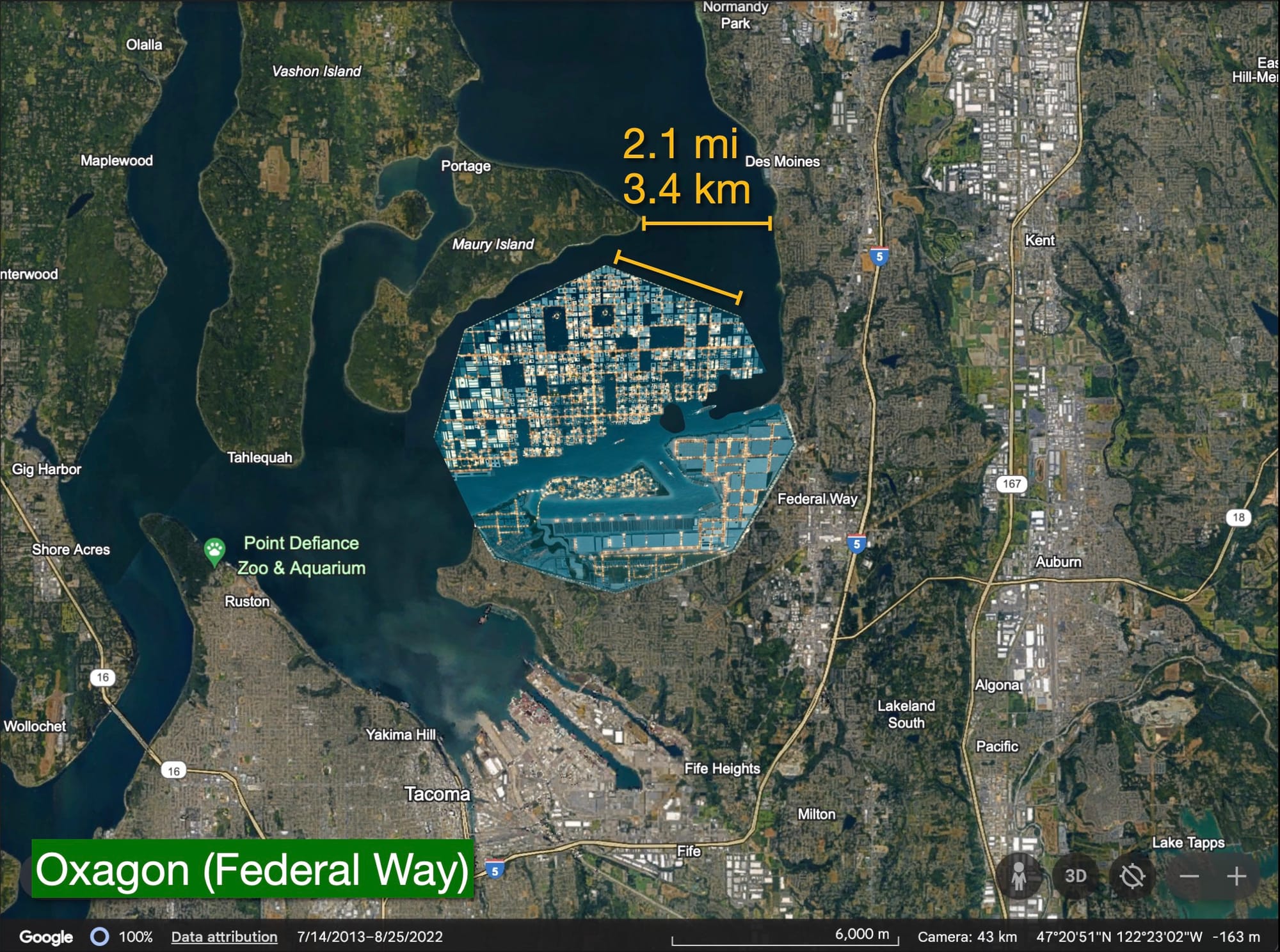 It’s also difficult to put a comparison on the 50 km2 (12,000 acres) of industrial space that’s proposed for this Oxagon. The Puget Sound Regional Council identifies 28,615 net acres of industrial lands in its four-county area. That’s space zoned industrial with right of way, parks, protected space and public facilities (SeaTac and other airports mostly) taken out. The Oxagon will have as much acreage as the entire Duwamish Waterway (5,062 acres) and the Port of Tacoma (5,160 acres) combined.