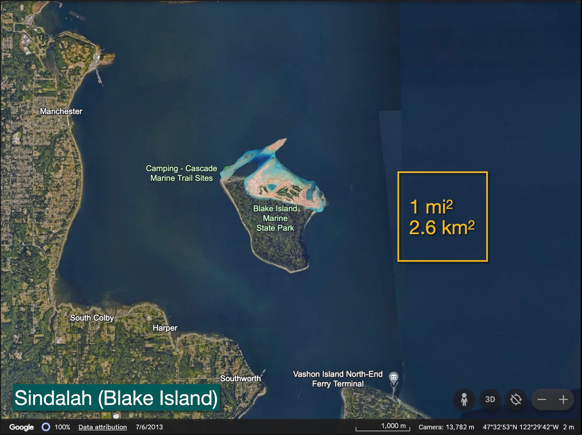 While there are a couple of similarly sized (read: TINY) Puget Sound islands that could be turned into a local Sindalah, many of them like Matia Island, Patos Island and Stretch Island are way to the north or south. The islands closest to Seattle are all fairly large. Whidbey (169 square miles), Vashon (80 square miles) and Bainbridge (65 square miles) are surprisingly expansive.