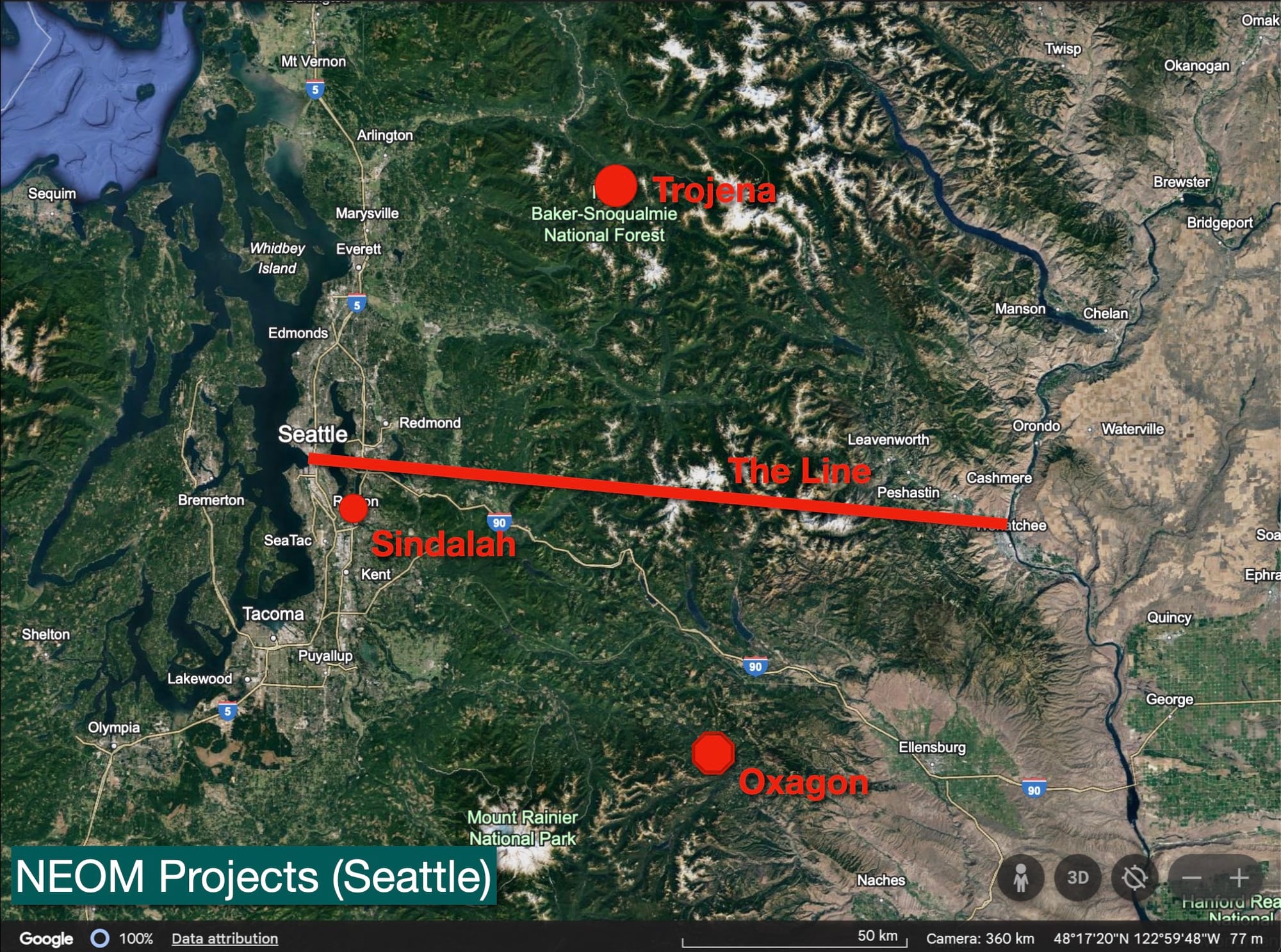 Just for fun, and to offer a sense of scale, I thought it would be cool to see what the NEOM projects looked like if they were built in and around Seattle. The projects would cover the region, from Mount Baker to Mount Rainier, and from the Sound to Wenatchee.