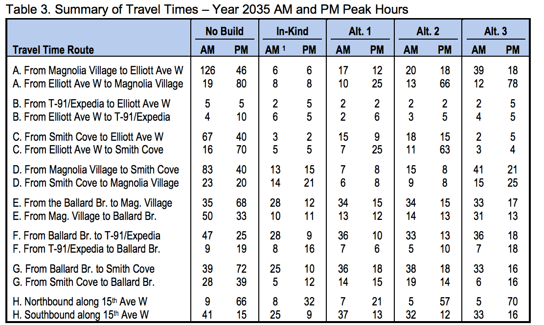 The idea of “no build” is really not addressed much in the report, but the dire travel times spelled out by the flawed traffic data are tucked away in the report. Bizarrely, the model shows a nine-minute travel time heading to Ballard during the morning peak, heightening the incredulity of the numbers.